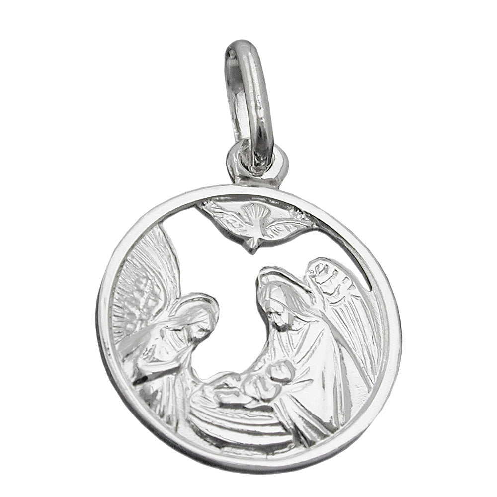 A beautiful religious pendant in 925 sterling silver, crafted to the highest jeweler's standards. The lustrous pendant depicts intricately detailed images of Mary and Joseph, both bending over the baby Jesus in the manger, while the Holy Spirit oversees the scene in the form of a dove. The relief in the small, round pendant, 15 mm in diameter, is punched out, and the back is matte and smooth. A particularly beautiful talisman with God's blessing!