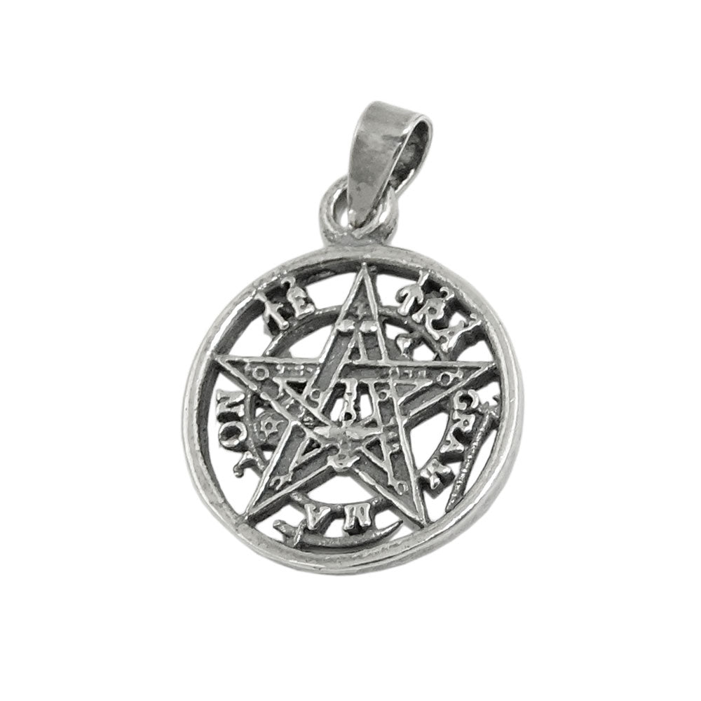 A small yet meaningful pendant! This 15mm, detailed pendant made of 925 sterling silver, antiqued in black, has quite a bit of flair: a pentagram, a five-pointed star within a circular pendant, inscribed with the word "Tetragrammaton," a saber, and a hoe. The reverse is plain. "Tetragrammaton" (English, in German: Tetragrammaton) refers to the Greek letters "YHWH," the Hebrew name for the one true God. The five points of the star symbolize the four elements: earth, fire, water, and air, crowned by the spirit, also called ether. The points of the star, connected in a continuous line, represent the balance of all elements in existence. The circle symbolizes perfection.