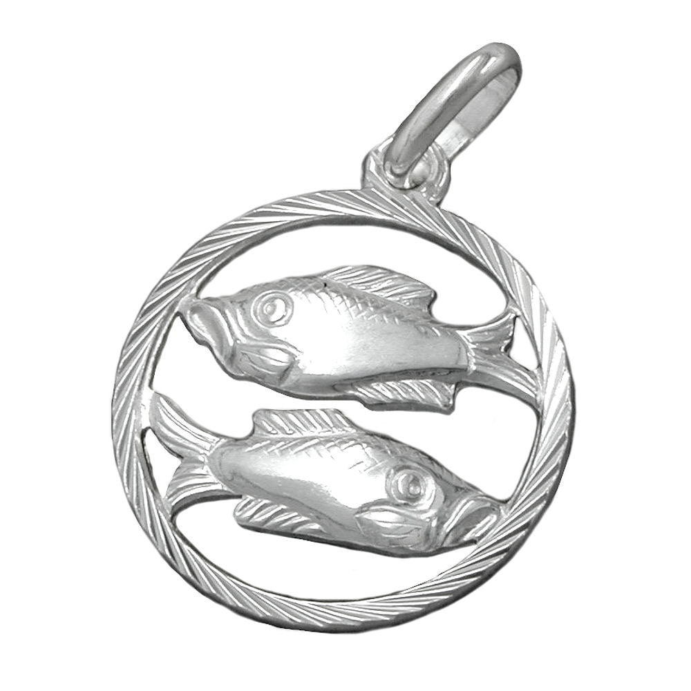 Delicately crafted, 15mm Pisces zodiac pendant in 925 sterling silver, featuring a diamond-cut circle. The very flat pendant features a molded front and a hollow back. The zodiac sign Pisces represents the birth date between February 20 and March 20 in astrology. A personalized gift for someone very special!
