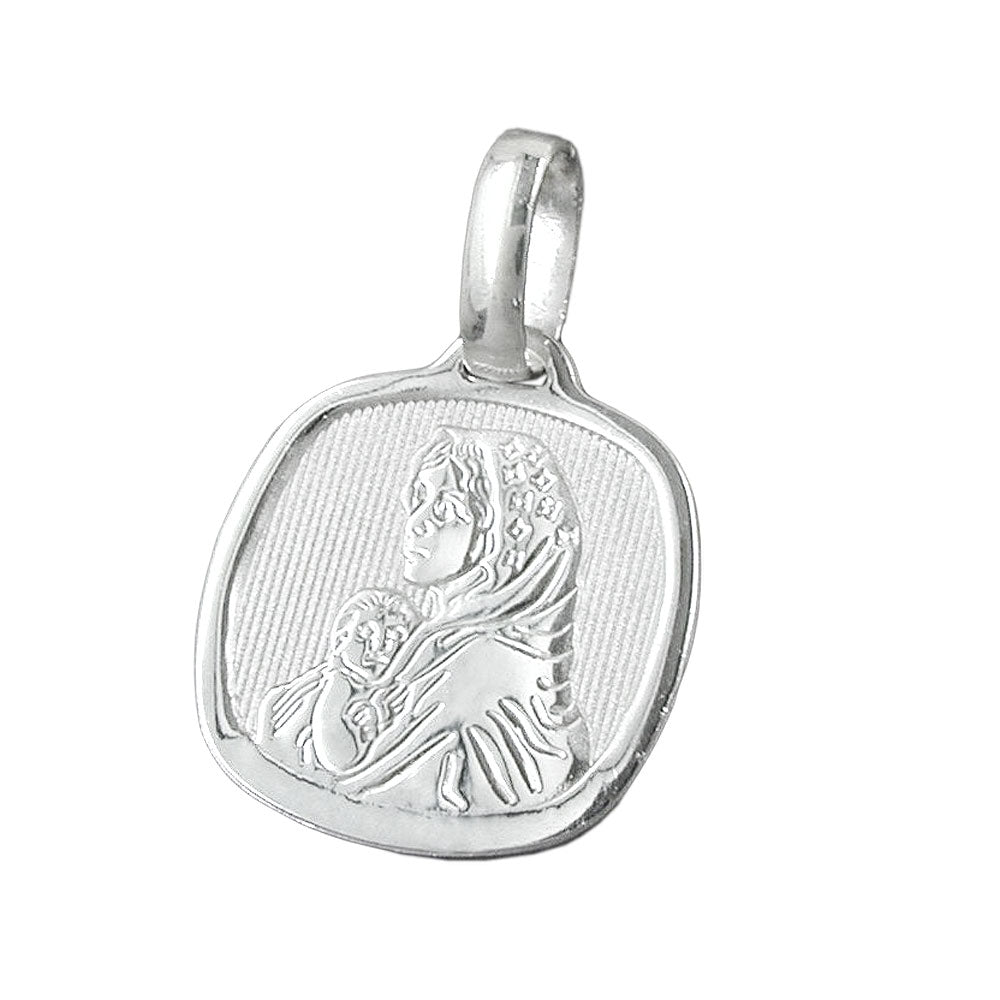 A beautiful religious pendant, a 16x15mm plate in 925 sterling silver with an embossed image of Mary and Child, crafted to the highest jeweler's standards. The back of the flat, solid pendant has a smooth, glossy finish and offers space for a small engraving. This beautifully detailed image of the Virgin Mary, protectively holding the infant Jesus in her arms, is a particularly beautiful talisman for mothers and their children!