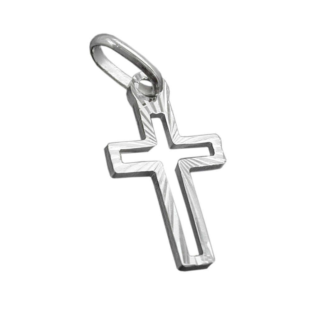 Small but mighty! This 16x9mm cross pendant in 925 sterling silver, crafted to the highest jeweler's quality, is embellished on the front with a radial diamond cut around the recessed open center, while the back has a smooth, glossy finish. It's a subtle yet decorative reference to the Christian creed. In Christianity, the vertical bar of the cross symbolizes the relationship between God and man. The horizontal bar connects the relationship between people. This silver cross is an ideal gift for baptism, confirmation, or other religious occasions.