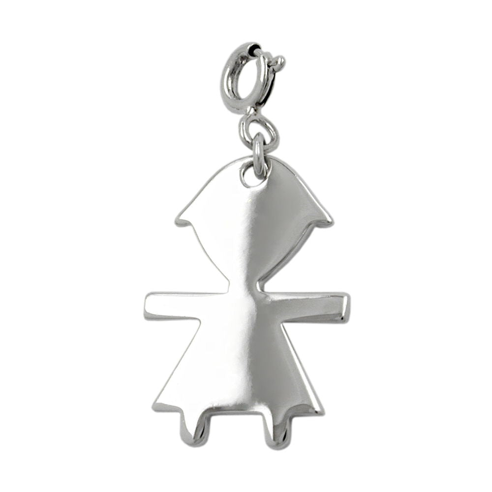 Stylized, 20x14mm girl charm pendant made of 925 sterling silver, crafted to the highest jeweler's quality. The solid pendant shines on both sides. The small spring ring provides dual utility as a pendant or charm for charm bracelets, necklaces, or anklets. To ensure long-lasting enjoyment, the surface has been rhodium-plated to protect against tarnish. Charm pendant motifs can be used to create personalized bracelets and necklaces, adding details that connect you to your personal preferences, memories, and character. Each charm pendant thus underscores your personality.