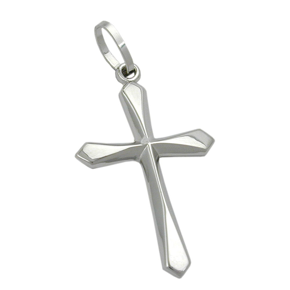 A stylish 23x14mm small cross pendant made of 375 white gold (9 carat), crafted to the highest jeweler's standards. The high-gloss gold cross features an interesting curve on the front and square, flattened cross ends; the back is smooth and shiny. A beautifully understated yet decorative reference to the Christian creed. In Christianity, the vertical bar of the cross symbolizes the relationship between God and man. The horizontal bar connects the relationship between people. This gold cross is an ideal gift for baptism, confirmation, or other religious occasions.