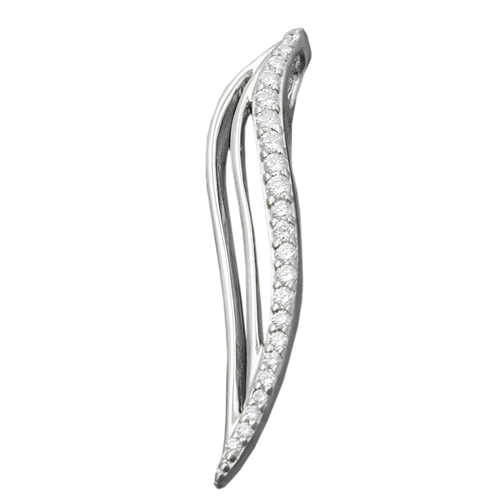 A beautiful, 32x6mm narrow pendant made of 925 sterling silver with zirconia stones, crafted to the highest jeweler's standards. This stylish silver pendant consists of three lines, gently curved like a long leaf, the outer line adorned with a row of small white zirconia stones. With this continuous pendant, the chain passes through the hidden bail in the upper part of the pendant, and the pendant appears to float on the chain. The high-quality rhodium plating ensures long-lasting enjoyment of this piece of jewelry. Whether for festive occasions or stylish wear to the office, you'll always make a dazzling entrance with this elegant pendant!