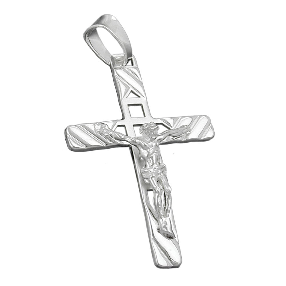 Jesus on the cross – classic religious pendant jewelry. Modernly designed silver cross pendant crucifix in 925 sterling silver of high jeweler quality. The abstractly openwork cross is a special eye-catcher. The openwork boxes in the center are matte, the curved horizontal stripes on the bar ends are shiny, and the detailed, shiny 3D body is firmly soldered. The large loop allows it to be strung on silver chains up to 3.5 mm wide or thicker leather cords. The Jesus cross is a perfect gift for Christians for baptism, communion, or confirmation. It is worn as a personal declaration of the Christian faith, although the cross with Jesus is predominantly worn by Roman Catholics, while Protestants prefer the (simpler) cross without Jesus.