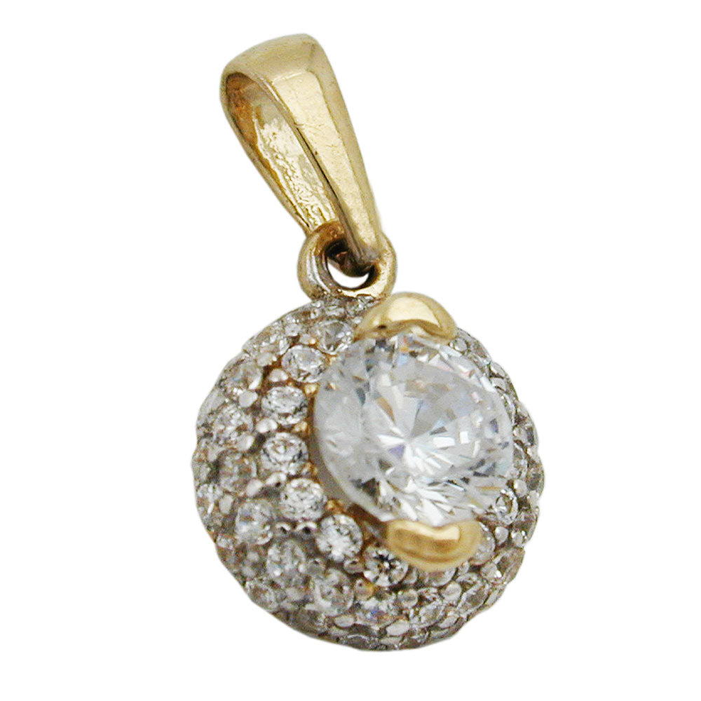 A beautiful 9mm gold pendant in 375 yellow gold (9 carat), crafted to the highest jeweler's standards. A large white zirconia is framed by a triple wreath of sparkling zirconias, each set using micro pavé or micro settings. A universally wearable, small, understated pendant that could become a favorite for your favorite jewelry.