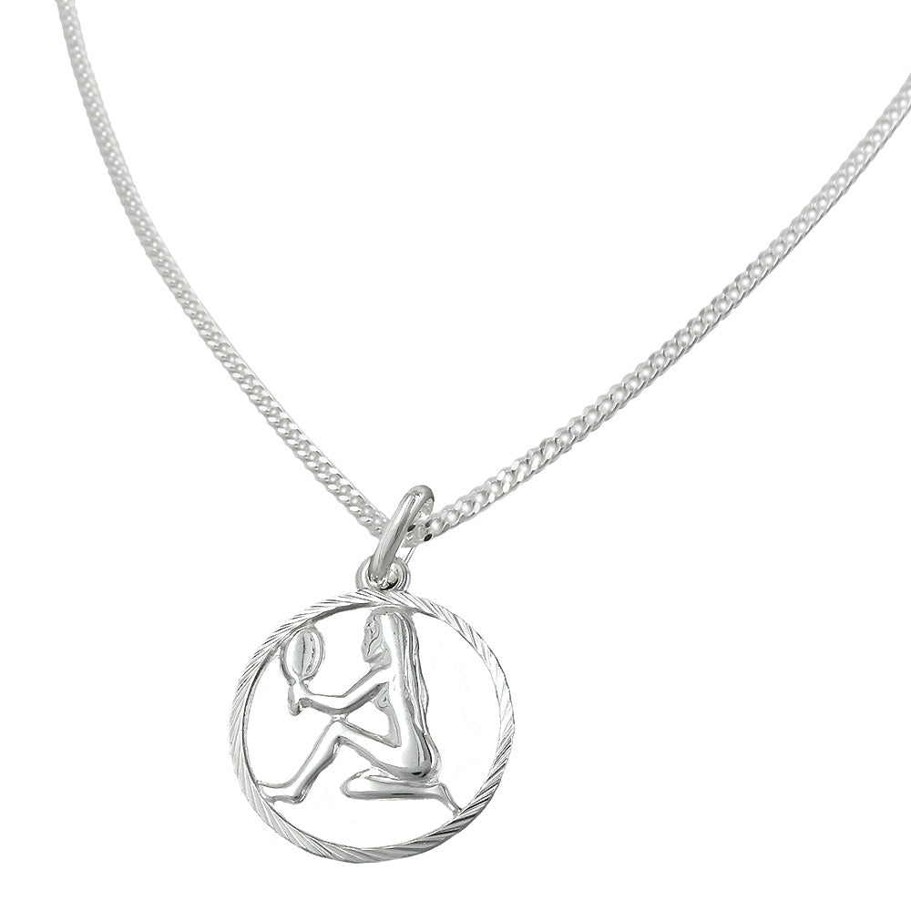 Der fein gearbeitete Anhänger zeigt das Jungfrau-Symbol in edler Relief-Optik, umrahmt von einem diamantierten, geschliffenen Rand, der für funkelnde Reflexe sorgt. Hergestellt aus echtem 925 Sterling Silber in hochwertiger Juwelierqualität, hängt er an einer 1,4 mm breiten, 45 cm langen Flachpanzerkette – robust und doch filigran.