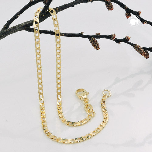 Luftig flache Goldkette in 585er Gelbgold (14 Karat) im Weitpanzer-Kettenmuster, ca. 2mm breit, gearbeitet in hochwertiger Juwelierqualität. Die zweifach diamantierte (geschliffene) glänzende Goldkette mit den geraden Kanten fällt geschmeidig weich und wirkt einfach elegant durch ihre Schlichtheit. Diese wunderschöne Schmuckkette kann einzeln solo oder in Kombination mit größeren Goldanhängern getragen werden. Ein wertvolles Geschenk und anhängliches Schmuckstück für den alltäglichen Gebrauch.
