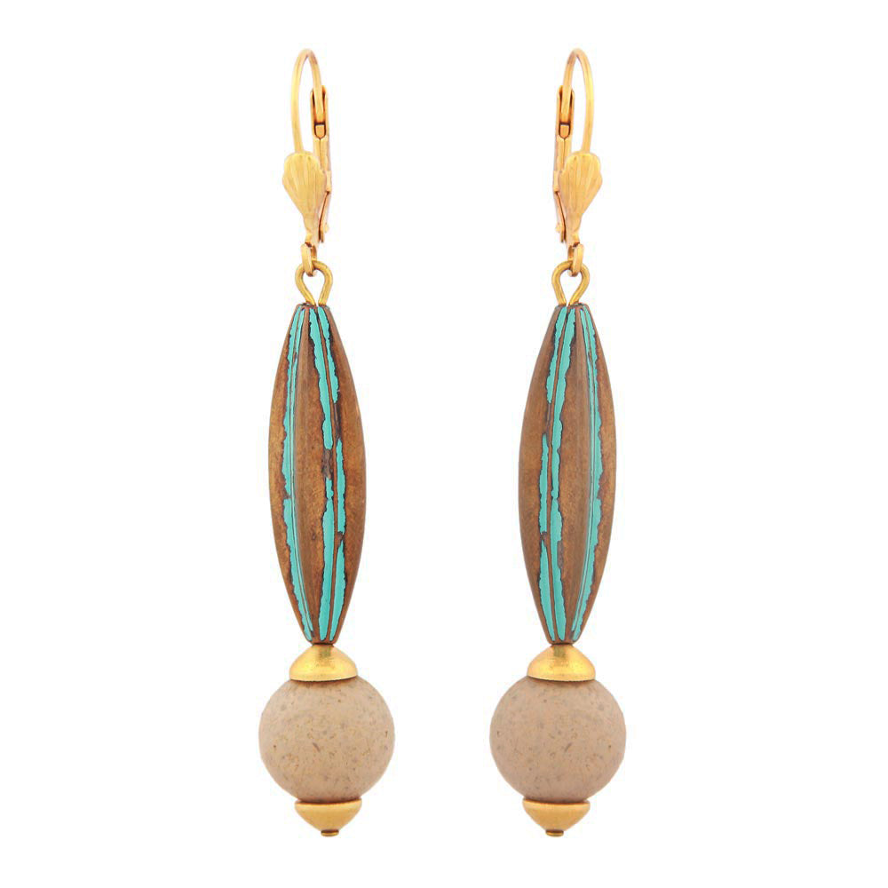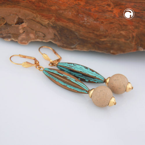 Not to be outmoded! These strikingly large costume jewelry earrings, with the weathered charm of a valuable historical piece, provide a fitting contrast to dull colors in outerwear. The 66mm long earring consists of a 10x7mm green-turquoise grooved plastic bead with a patina effect that shimmers through with an antique brass color, and a 12mm light brown round plastic bead. The 66x12mm earring pendant hangs from a gold-colored brass ear hook. Sold only in pairs.