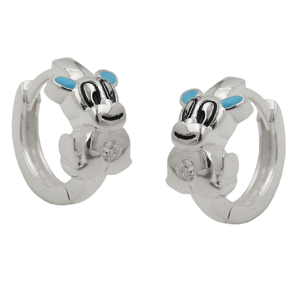 Adorable, 12x12mm children's hoop earrings in 925 sterling silver, painted black and light blue, crafted to the highest jeweler's standards. These earrings feature a whimsical fantasy creature, resembling a dog, with light blue painted ears, black-lined eyes and mouth, and a sparkling white zirconia on the belly. A wonderful gift for a child's birthday, first day of school, or just for a special occasion!