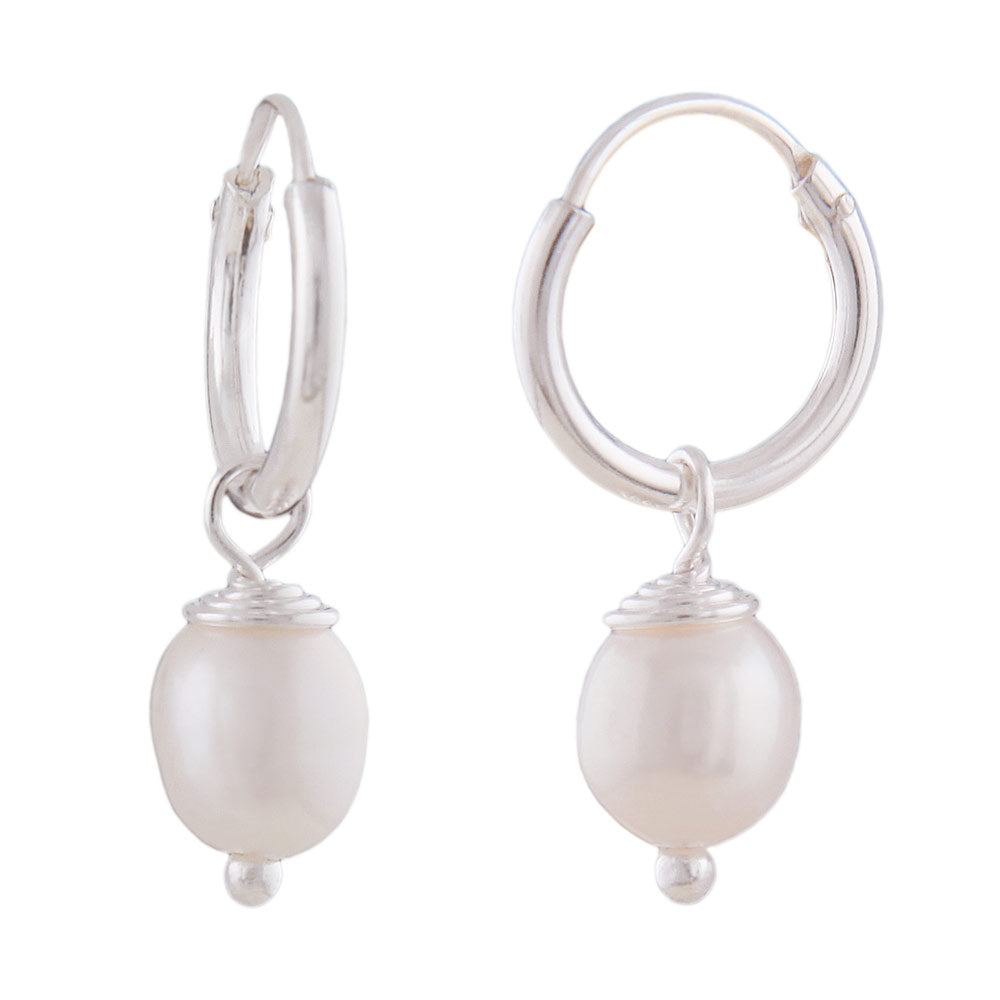 Simple, understated wire hoop earring in 925 sterling silver with an eye-catching freshwater cultured pearl, crafted to high-quality jeweler's quality. On this very small hoop earring – 10mm in diameter and 1.1mm thick – with a post clasp, an approximately 6x5mm pendant with an oval or teardrop-shaped freshwater cultured pearl swings back and forth on the tube. The ear hook slides into the opposite tube, providing a simple and secure clasp – making it suitable for children's jewelry. Cultured pearls are cultivated in freshwater lakes and rivers and differ from real pearls only in their lack of a core. Despite being cultivated, they remain natural products and may vary slightly in color and shape. The properties of cultured and natural pearls, such as their chemical composition, hardness, and optical characteristics, are the same. As a symbol of purity and beauty, pearls are a beautiful bridal piece that can also be worn on other special occasions and in everyday life.