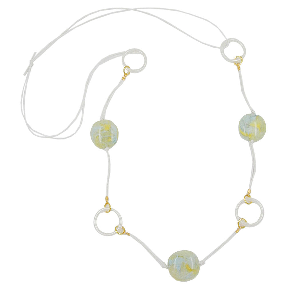 Wunderschöne pastellfarbene Modeschmuck-Kette mit 3 beidseitig gewölbten, 25x25x12mm großen, gelb-blau-grün-marmorierten Nuggetperlen aus hochwertigem Kunststoff, mit goldfarbenen Endteilen an perlmutt-weißen Kunststoff-Ringen und an doppelter weißer Baumwollkordel befestigt. Die ca. 100cm lange Kette passt gut zur hellen, sommerlich leichten Bekleidung. Lange Ketten ab 60cm eignen sich gut als Pulloverketten und können ohne den Verschluss zu öffnen über den Kopf angelegt werden. Farbiger Schmuck betont die Farben der Kleidung oder setzt zusätzliche Akzente.