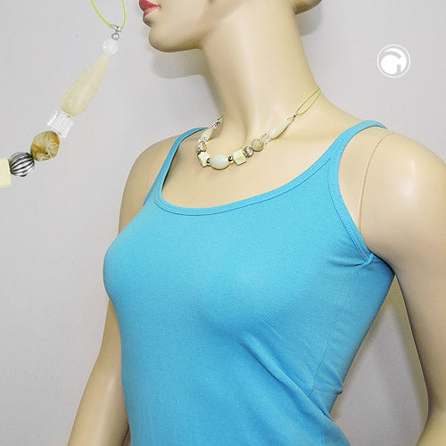 Diese helle Halskette passt hervorragend zu sommerlicher Kleidung und gebräunter Haut. Die hochwertigen Kunststoffperlen in hellen Farben sind bei diesem wunderschönen Collier geschmackvoll mit altsilber- und chromfarbenen Kunststoffperlen kombiniert, den Blickfang bildet die 26x16mm große, hellgrüne Oliven-Perle in der Mitte. Der gefädelte Mustersatz wird durch die doppelte lindgrüne Baumwollkordel aufgenommen, dadurch liegt die 45cm lange Kette angenehm weich am Hals. Der Verschluss besteht aus einem silberfarbenen Karabiner plus Verlängerungskettchen aus eloxiertem Aluminium.