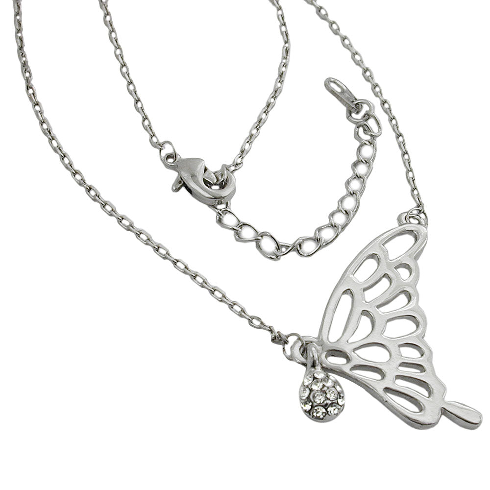 Das kleine feine Collier mit dem 30x20mm großen Anhänger Flügel ist 42cm lang, mit dem Distanzkettchen kann es bis auf 47cm verlängert werden. Der filigrane Flügel hängt beidseitig aufgehängt an einer 0,8mm dünnen Ankerkette und liegt schön breitgefächert im Halsausschnitt, daneben baumelt ein 6x4mm großer Tropfen mit vielen Kristall-Glassteinen für den Glitzer-Effekt. Der an einen halben Schmetterlingsflügel erinnernde Anhänger ist ein schönes Geschenk für Teenager und romantische Träumer.