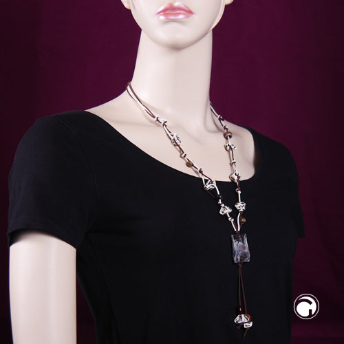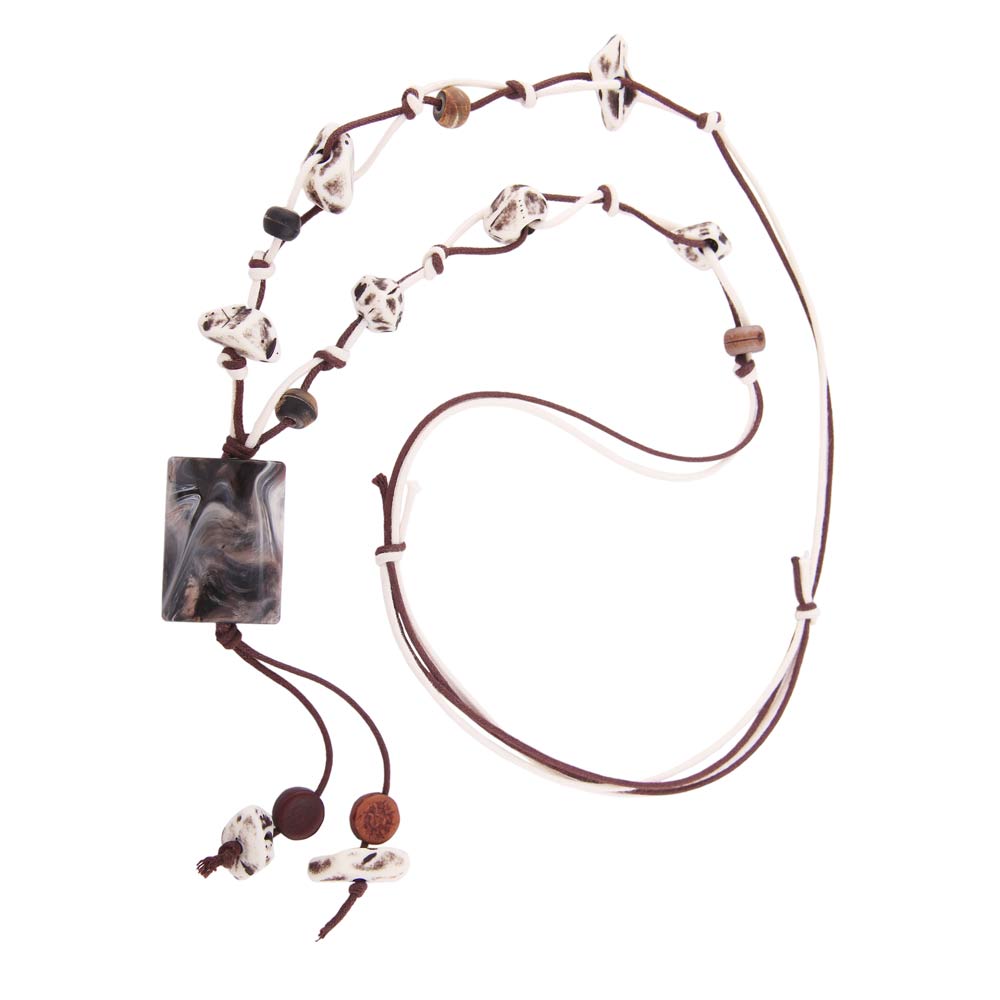 Dekorative Modeschmuck-Kette in Y-Form mit baumelnden Enden, Gesamtlänge ca. 90cm lang. Blickfang ist die 35x25mm große, braun-wolfsgrau-marmorierte, hochwertige Kunststoffperle in der Mitte, Pillow genannt - jede Perle ist ein Unikat! - kombiniert mit schwarz-weißen unrunden Kunststoffperlen und braunen Kunststoffperlen, kunstvoll eingeknotet in zwei Stränge von naturfarbener und brauner Baumwollkordel, einkürzbar mittels Schiebeknoten. Diese wunderschöne Kette passt gut zum naturverbundenen Kleidungsstil und zu allen erd- und naturfarbenen Kleidungsstücken. Lange Ketten ab 60cm eignen sich gut als Pulloverkette und können ohne einen Verschluss zu öffnen über den Kopf angelegt werden.