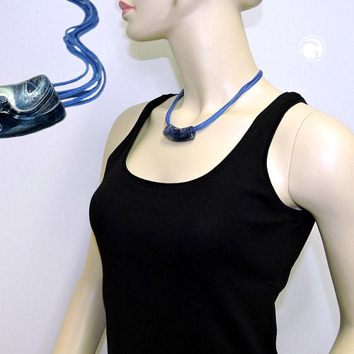 Mit dieser zeitlos schönen Modeschmuck-Kette können Sie den blauen Farbton Ihrer Kleidung unterstreichen oder zusätzliche Akzente setzen. Der 54x19mm große Anhänger aus Kunststoff liegt wie ein flach gedrücktes und leicht gebogenes Rohr gut im Dekolleté an. Die Farben blau, silber, dunkelblau und klar sind miteinander vermischt (marmoriert) und jeder Anhänger ist dadurch einzigartig im Aussehen. Durch den Tube Tunnel führen 6 Stränge von blauer 1mm-Baumwollkordel und das 45cm lange Collier wird verschlossen mit einem silberfarbenen Karabiner plus Verlängerungskettchen aus eloxiertem Aluminium.