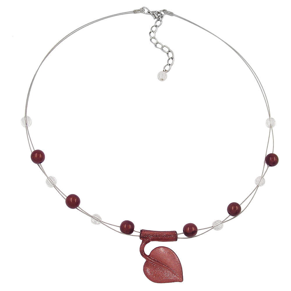 Wunderschönes Drahtcollier mit einer 28x20mm großen, altrosa-flitterbedeckten Kunststoff-Perle in Blattform, passend zum Trend der floralen Mode und als modisches Highlight zu farbenprächtigen Oberteilen. Das einzelne Blatt am Rohr ist kombiniert mit kleinen auberginefarbenen und weiß-transparenten Perlen, doppelt aufgezogen auf kunststoffummantelten Edelstahldraht mit silberfarbenem Karabiner-Verschluss plus Verlängerungskettchen aus eloxiertem Aluminium und einer Perle als Abschluss.