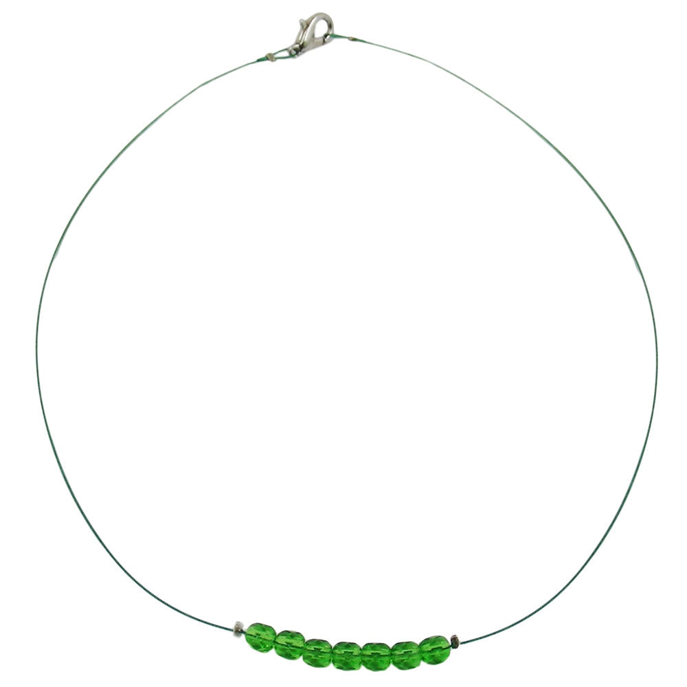 Zierliches Drahtcollier mit grün-transparenten, geschliffenen Glasperlen in grün-transparent, aufgezogen auf grünen kunststoffummantelten Edelstahldraht mit silberfarbenem Karabiner-Verschluss.