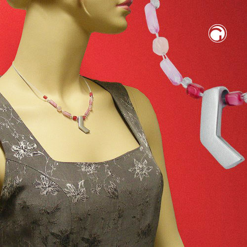 Diese modisch aktuelle Halskette passt perfekt zu femininen Oberteilen in zart rosa Pastellfarben. Um den matt-silberfarbenen 29x7mm großen Metall-Anhänger aus Zinnguss sind zart-rosafarbene Glasperlen auf doppelten weißen weichen kunststoffummantelten Edelstahldraht gleichmäßig aufgezogen. Das zierliche Drahtcollier wird mit einem silberfarbenen Karabiner plus Verlängerungskettchen aus eloxiertem Aluminium geschlossen.