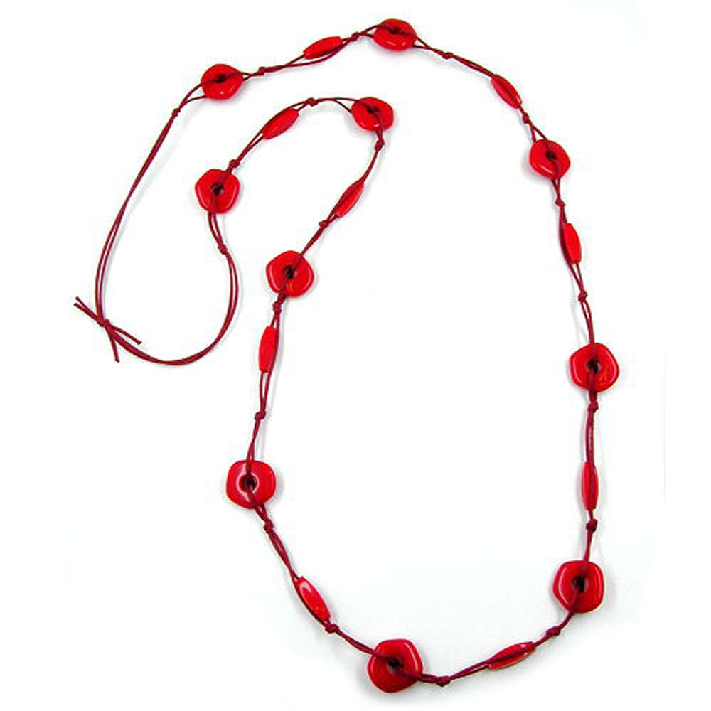 Diese wunderschöne lange rote Modeschmuck-Kette kommt gänzlich ohne Metallbestandteile aus. Zwischen zwei lüstrierten (gewachsten) roten Baumwollkordeln wurden 20mm große, unrunde Scheibenperlen und 18x11mm große (kleine) Vierkant-Oliven, rot-glänzend, kunstvoll eingeknotet. Die komplett rote Kette ist 100cm lang und kann auch doppelt um den Hals gelegt werden. Lange Ketten eignen sich gut als Pulloverketten und können ohne den Verschluss zu öffnen über den Kopf angelegt werden.