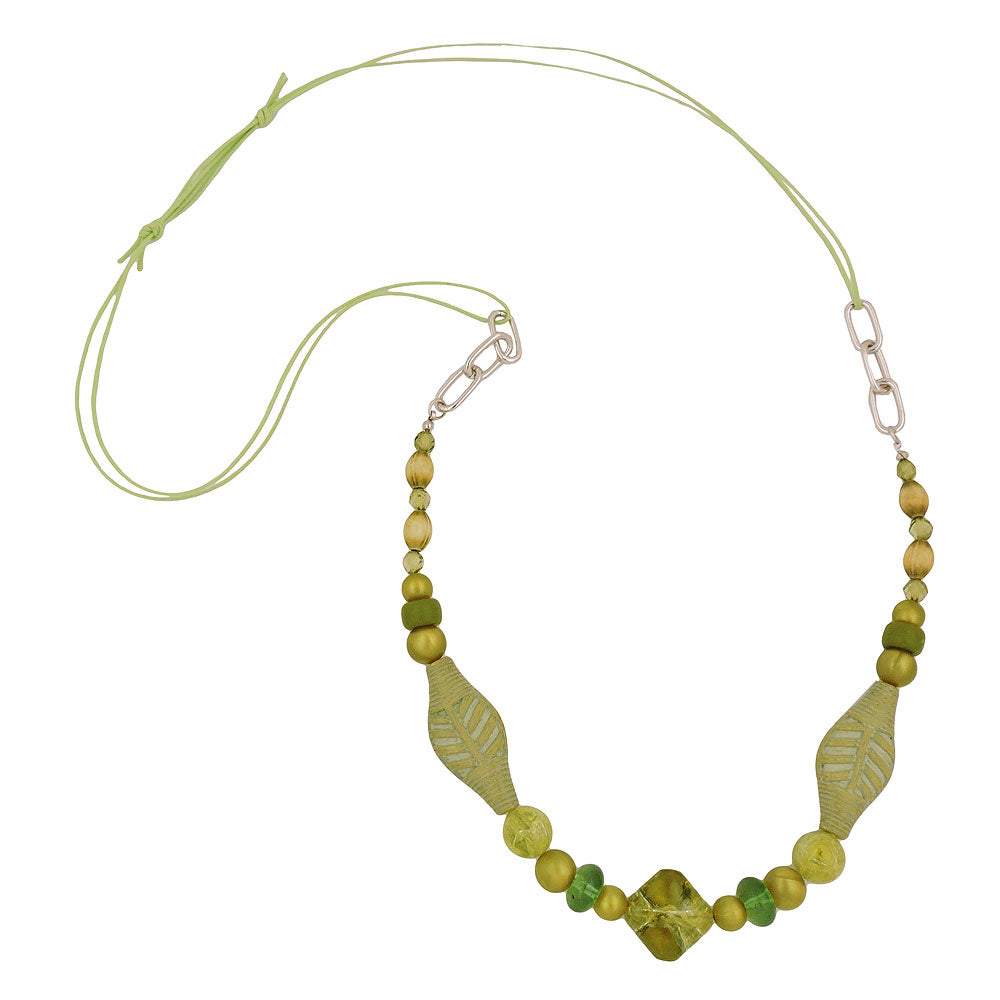 Bei dieser hellgrünen Modeschmuck-Kette sind verschiedene hochwertige lindgrüne Kunststoffperlen wunderschön kombiniert. Der gefädelte Perlenkettenteil ist mit einer doppelten hellgrünen 0,6mm-Baumwollkordel verbunden, dadurch liegt die Kette leicht und angenehm am Hals oder unter einem Kragen. Die Gesamtlänge beträgt 80cm und ist längenverstellbar mittels Schiebeknoten. Blickfang sind neben den zwei 40x18mm großen olivgrünen Perlen mit dem Blattmuster auch die extravagante Crashperle in der Mitte. Auch die rhodinierten Ankerkettenglieder aus einer Messinglegierung, die am Übergang zum textilen Teil der Kette auf jeder Seite funkeln, sind ein raffiniertes Detail dieser Kette. Lange Ketten ab 60cm eignen sich gut als Pulloverkette und können ohne den Verschluss zu öffnen über den Kopf angelegt werden. Farbiger Schmuck betont die Farben der Kleidung oder setzt zusätzliche Akzente.