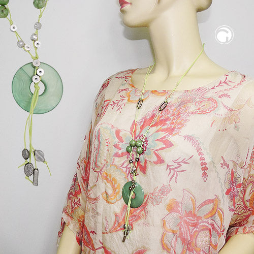 Wunderschöne Kette in Y-Form mit baumelnden Enden im frühlingshaften mintgrünen Farbton, ohne Metallbestandteile, Gesamtlänge 90cm, einkürzbar mittels verstellbarem Schiebeknoten. Mittelpunkt der langen Modeschmuck-Kette ist der 53mm große mintgrüne seidig schimmernde Anhänger, der zusammen mit verschiedenen anderen hellgrünen und silberfarbenen hochwertigen Kunststoffperlen auf vier lüstrierten (gewachsten) hellgrünen Baumwollkordeln kunstvoll eingeknotet wurde. Die aufwendig hergestellte Kette passt zu sommerlicher Kleidung genauso gut wie zum sportlichen Jeanslook und setzt farbige Akzente zu dunkler Kleidung. Lange Ketten eignen sich gut als Pulloverketten und können ohne den Verschluss zu öffnen über den Kopf angelegt werden.