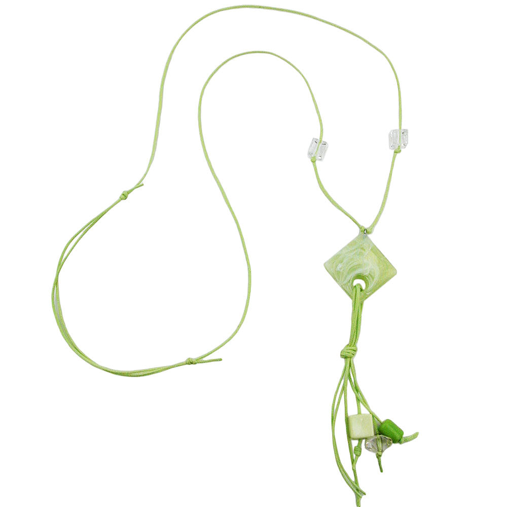 sommerliches Collier mit Kunststoff-Viereck 25x25mm hellgrün-marmoriert, kombinert mit Kunststoff-Perlen hellgrün und kristall, kleine Glas-Walze hellgrün, 0,6mm Kordel hellgrün, längenverstellbar mittels Schiebeknoten, in Deutschland gefertigte Handarbeit