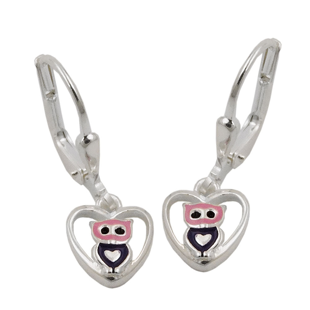 This colorful children's jewelry earring with an owl in 925 silver is a wonderful gift for clever little minds! An approximately 8mm silver heart hangs from the earring, containing an elaborately pink and dark purple lacquered owl with a heart-shaped, shiny silver belly. Leverback earrings are particularly suitable as children's jewelry. The earring with a hinged hoop stays securely in the ear and prevents it from being pricked at the neck. In mythology and folklore, owls are a symbol of wisdom, insight, and intuition. Scientific institutions often have owls in their logos, and in Greece, the owl is said to be the companion bird of the goddess Athena, the protector of Athens and goddess of wisdom.