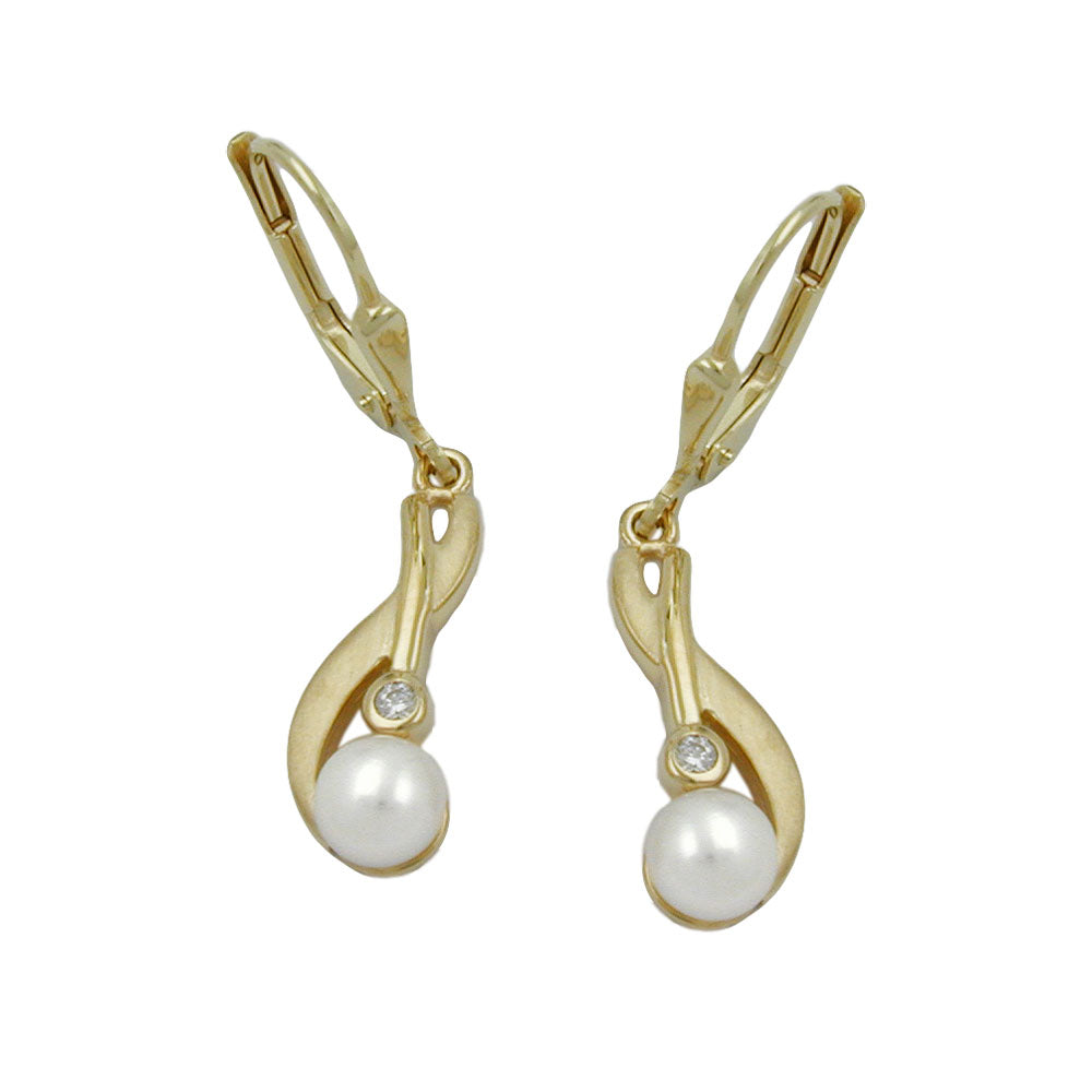 Beautiful 30mm x 6mm ear clips made of 375 yellow gold (9 carat) with a freshwater cultured pearl and zirconia, crafted to the highest jeweler's quality. On the 18mm long ear pendant, a matte-finished arch gently curves like a treble clef around the straight, shiny line, at the end of which an approximately 4.5mm white freshwater cultured pearl, topped with a small, sparkling white zirconia, provides the final accent. The beautiful right-left version of these elegant earrings with a hinged hoop flatters the shape of the face. Pearls, a symbol of purity and beauty, are classic bridal jewelry that can also be worn on other special occasions and in everyday life. Cultured pearls are cultivated in freshwater lakes and rivers and differ only in their lack of a nucleus. The properties of cultured pearls and natural pearls, such as their chemical composition, hardness, and optical characteristics, are the same. A gift from nature for the beauty of nature.