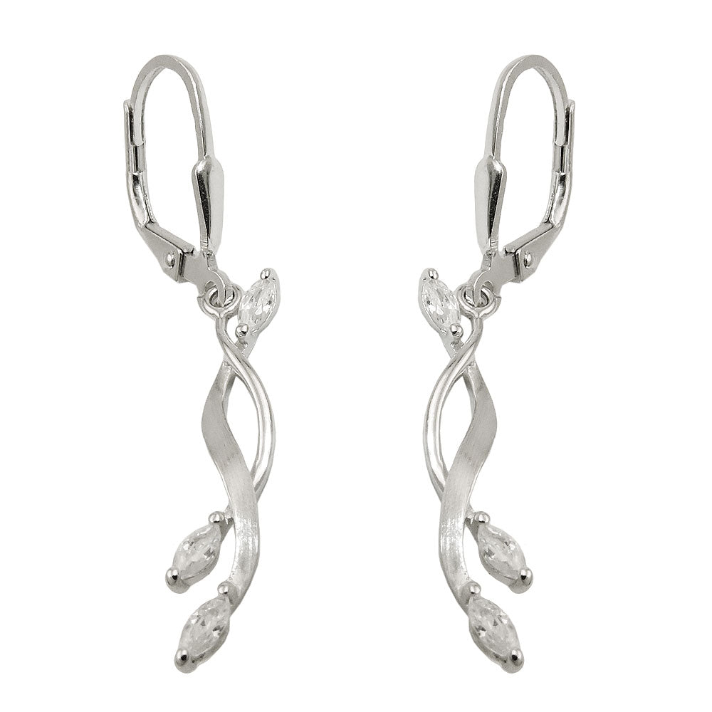 Beautiful earring in 925 sterling silver with zirconia, crafted to the highest jeweler's quality. Two delicate, curved silver bars, one matte-finished, wind around each other and are adorned at the ends with sparkling white 5x3mm oval zirconias. The 25x5mm earring pendant is closed at the back. The surface has been rhodium-plated to protect against tarnish for long-lasting enjoyment. Make these elegant earrings with a hinged closure your favorite piece of jewelry—whether for the office or for special occasions—they're always the perfect earrings!
