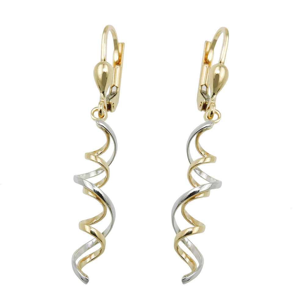 Decorative women's earrings – drop earrings with a hinged hoop – made of 375 gold (9 karat) with a two-tone effect, crafted to high jeweler's quality, measuring 43x7mm. Two approximately 30mm long, shiny spirals of varying thickness, made of alloyed 375 white gold and 375 yellow gold, are firmly connected at their ends and hang from a gold earwire. Whether for festive occasions or stylish wear at the office – these elegant drop earrings will always make a dazzling entrance!
