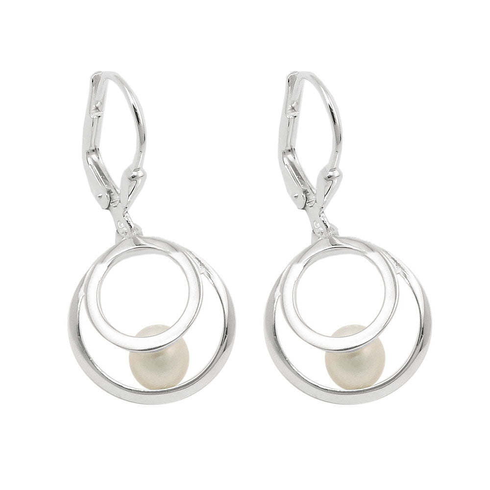 Here, the pearl has found its firm hold! In this beautiful 925 sterling silver earwire with an approx. 5mm freshwater cultured pearl, crafted to the highest jeweler's quality. The freshwater cultured pearl swings firmly between two circles on the dangle earring, the smaller one measuring 9mm in diameter, the other 13mm. This creates a beautiful 3D effect in these playful, airy earrings with a hinged bail. Pearls are considered a symbol of purity and beauty. Cultured pearls are cultivated in freshwater lakes and rivers and differ only in the lack of a nucleus. The properties of cultured pearls and natural pearls, including their chemical composition, hardness, and optical characteristics, are the same. A gift from nature for the beauty of nature. Beautiful earrings for a bride that can also be worn on other special occasions.