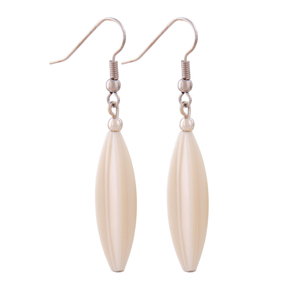 These feather-light costume jewelry earrings are the perfect finishing touch to your outfit. The 50mm long earring consists of a single 30x9mm, ivory-colored plastic olive with a small silver-colored pearl as a topping and a silver-colored brass (white bronze) ear hook. Sold in pairs only.