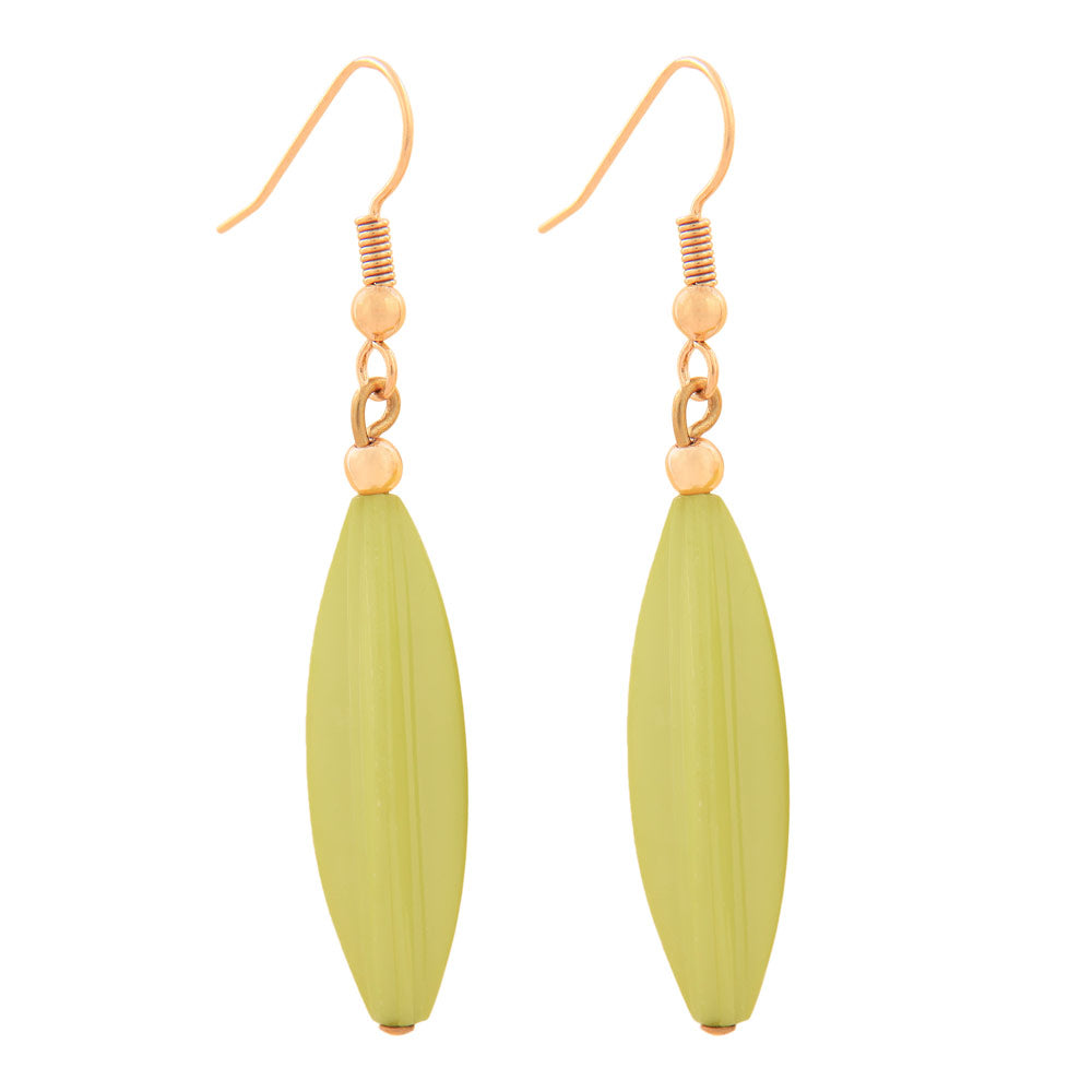 These feather-light costume jewelry earrings are the perfect finishing touch to your outfit's colors. The 50mm-long earring consists of a single 30x9mm, rich, light green, grooved plastic olive, topped with a small gold-colored pearl and a gold-colored brass ear hook. Colorful jewelry accentuates the colors of your outfit or adds a touch of sparkle, perfectly rounding off your look. Sold in pairs only.