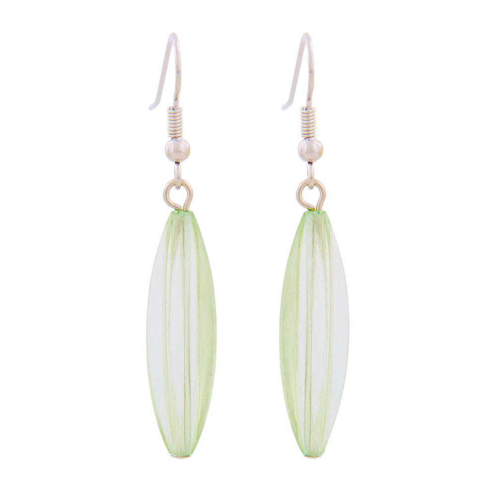 These feather-light costume jewelry earrings are the perfect finishing touch to your outfit's colors. The 50mm long earring consists of a single 30x9mm, light green-transparent plastic grooved olive and a silver-colored brass (white bronze) ear hook. Colorful jewelry accentuates the colors of your outfit or adds a touch of sparkle, perfectly rounding off your look. Sold only in pairs.