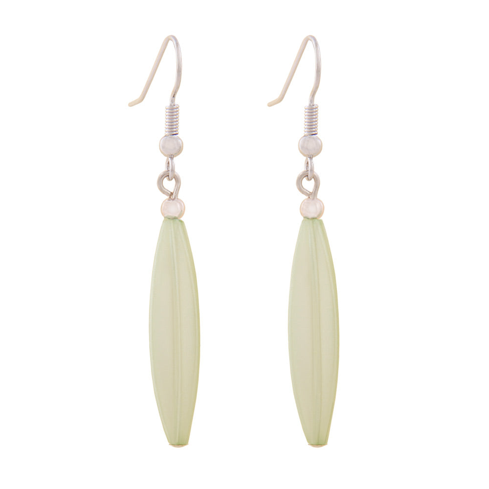 These feather-light costume jewelry earrings are the perfect finishing touch to your outfit's colors. The 50mm long earring consists of a single 30x9mm, light green, wax-colored, shiny, grooved plastic olive, topped with a small silver-colored pearl and a silver-colored brass (white bronze) ear hook. Colorful jewelry accentuates the colors of your outfit or adds a touch of sparkle, rounding off your look with brilliance. Sold only in pairs.
