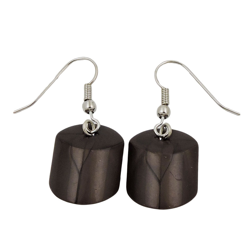 These small, lightweight costume earrings are the perfect finishing touch to your outfit. The earrings consist of a small pendulum with a 20x15mm slanted plastic bead, silky brown, attached to a silver-colored brass (white bronze) earwire. Sold in pairs.