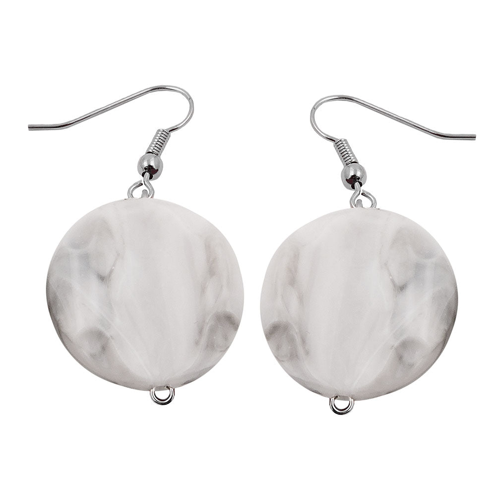 These small, round, fashion jewelry earrings are the perfect finishing touch to your outfit. The earrings consist of a pendulum with a 22mm, 8mm-thick, gray-and-white marbled plastic bead disc with a relief-like surface texture, attached to a silver-colored brass (white bronze) ear hook. Total length including hook: 44mm. Sold in pairs.