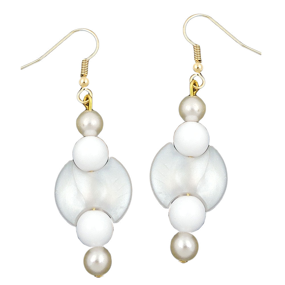 These beautiful, summery, lightweight fashion earrings in neutral white will complement any color of your outfit. The smart earrings consist of an 18mm waxy white disc with cutouts on both sides to accommodate the small, round, 8mm white spacer beads. They are framed at the beginning and end by two waxy white glass beads. They are attached to a gold-colored brass earwire. Total length including the hook is 55mm. Sold in pairs.