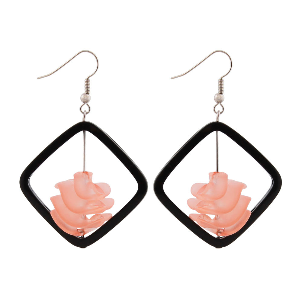 These lightweight, strikingly large costume jewelry earrings with a movable, apricot-colored, transparent spiral bead in the center of a black square are a real eye-catcher. The earrings consist of a shiny black, 32x32mm square plastic frame, within which a beautiful, 20mm high-quality plastic bead can move freely vertically on a headpin. The silver-colored brass (white bronze) ear hook is attached to one corner; the total length of the earrings is approximately 60mm. Sold in pairs.