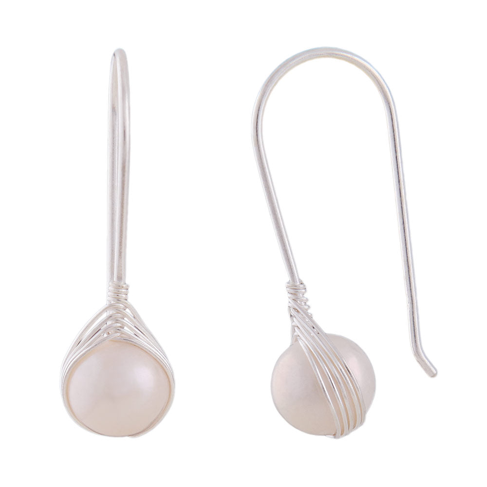 Classic pearl earrings in a new style! These approximately 28mm long, fixed ear hooks are crafted from 925 sterling silver and are crafted to the highest jeweler's quality. An approximately 8mm white freshwater cultured pearl is set in a skillfully braided silver wire. The large ear hook ensures a secure fit and is easy to insert. Cultured pearls are cultivated in freshwater lakes and rivers and differ from real pearls only in their lack of a nucleus. Despite being cultivated, they remain natural products and may vary slightly in color, shape, and surface texture. The properties of cultured and natural pearls—such as their chemical composition, hardness, and optical characteristics—are the same. As a symbol of purity and beauty, pearls are a beautiful bridal adornment that can also be worn on other special occasions and in everyday life.