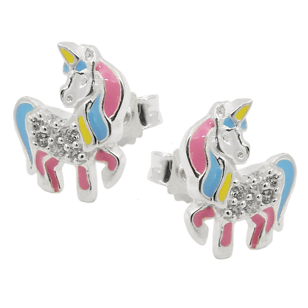 There's magic in the air here! Enchanting 10x8mm small children's jewelry unicorn stud earrings in 925 sterling silver with 6 small, sparkling white zirconia stones of high-quality jeweler's quality. The pastel colors of the colorfully decorated unicorn – pink, yellow, and light blue – have been lacquered. In the mythology of many cultures since ancient times, the unicorn has embodied innocence and purity, always fighting alongside us for the good cause. A beloved piece of jewelry to dream about and an ideal gift for all little princesses these days.