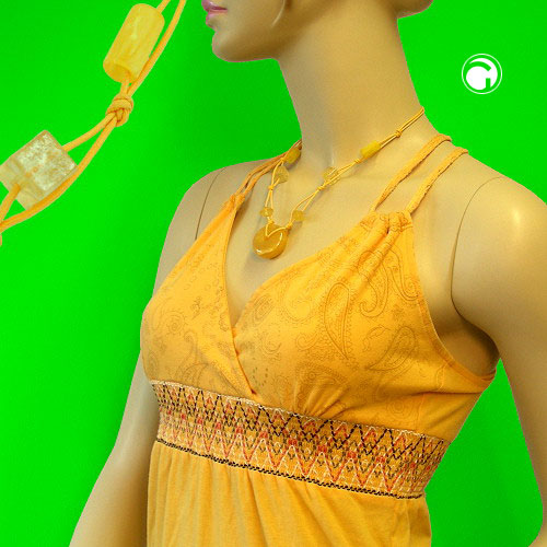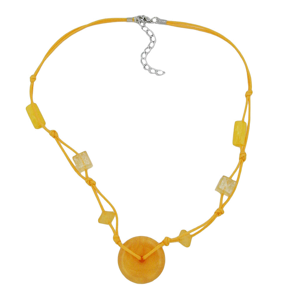 Dekoratives Modeschmuck-Collier im sommerlichen Gelb mit einer wunderschönen gelb-seidig-marmorierten glänzenden Kunststoffperle in der Mitte. Die 30x11mm große Perle Scheibe Rad wurde kunstvoll eingeknotet mit diversen anderen gelb-transparenten Kunststoffperlen in eine doppelte lüstrierte (gewachste) gelbe 0,6mm-Baumwollkordel und wird mit einem silberfarbenen Karabiner plus Verlängerungskettchen aus eloxiertem Aluminium geschlossen. Die helle freundliche sonnengelbe Farbe passt gut zur Frühlings- und Sommermode und fällt auch gut als Kontrast bei dunkler Kleidung auf.