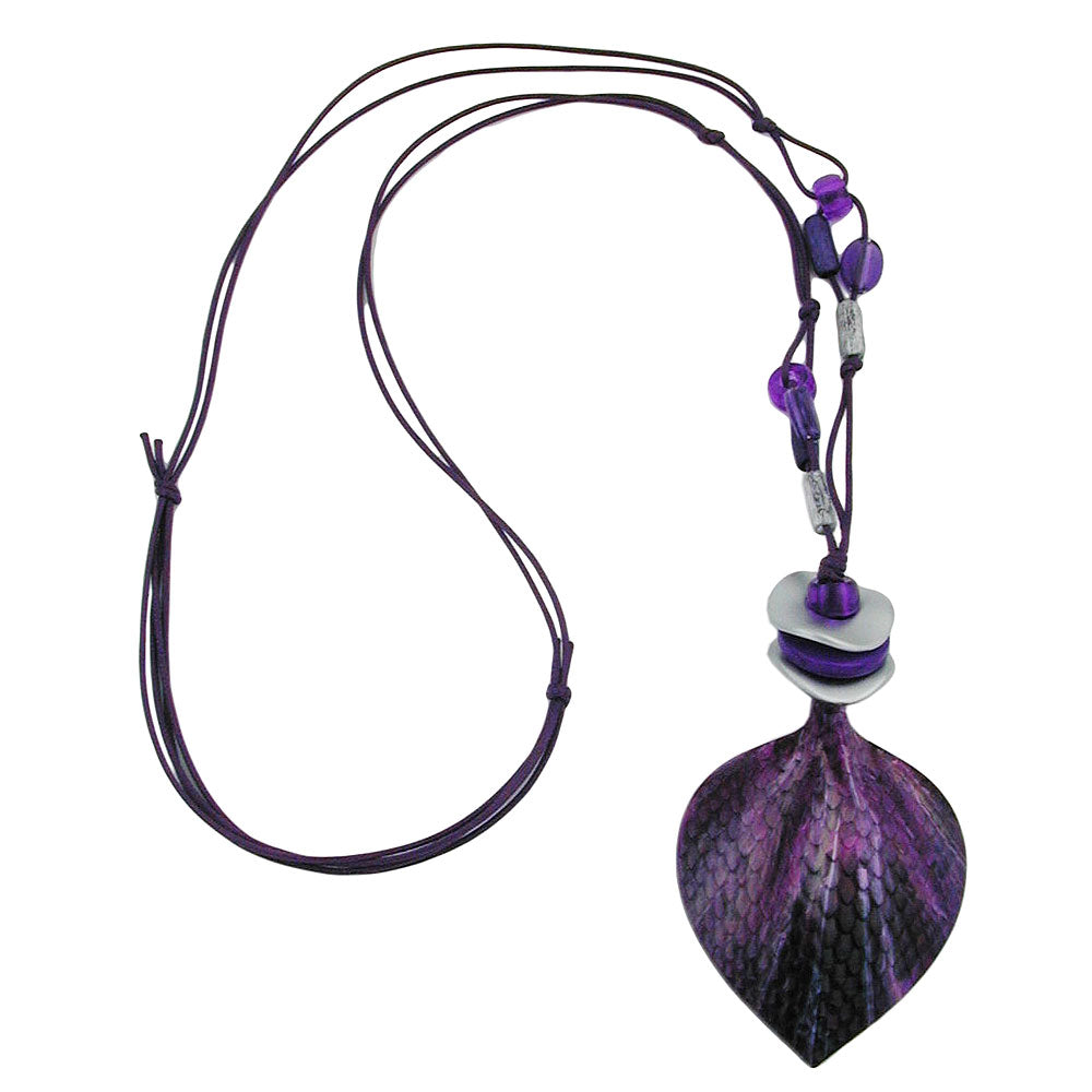 Diese wunderschöne lange Modeschmuck-Kette mit dem auffällig großen Anhänger passt in dem dunklen Lila-Farbton besonders gut zur Herbst- und Winterkleidung. Der 82x56mm große glänzende Anhänger aus Kunststoff hat die Form eines Blattes und die Oberfläche ist reliefartig wie kleine Schuppen ausgeformt, deshalb die Bezeichnung Schuppenblatt. Durch die unterschiedliche purpur-lila-weiße Marmorierung ist jedes Teil ein Unikat. Der markante Anhänger hängt an einer doppelten dunkellilafarbenen Baumwollkordel, in die lila-transparente und chromfarbene Kunststoffperlen kunstvoll eingeknotet wurden. Die 95cm lange Kette besitzt einen verstellbaren Schiebeknoten zum Regulieren der Länge. Lange Ketten eignen sich gut als Pulloverketten und können ohne den Verschluss zu öffnen über den Kopf angelegt werden. Lange mollige Kleider und einfarbige Oberteile bekommen mit dieser auffälligen Kette das schmückende Extra. Alle Bestandteile dieser rustikalen Modeschmuck-Kette wurden in Deutschland produziert und die Kette in Handarbeit fertiggestellt.