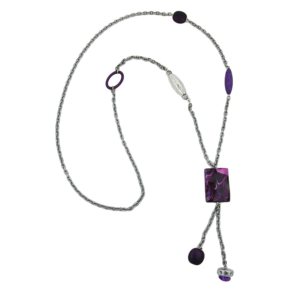 Dekorative Modeschmuck-Kette in Y-Form mit baumelnden Enden, 90cm lang. Blickfang ist die 35x25mm große, dunkellila-weiß-marmorierte, hochwertige Kunststoffperle in der Mitte, Pillow genannt - jede Perle ist ein Unikat! - in Kombination mit lilafarbenen, chrom- und altsilber-glänzenden Kunststoffperlen, gekettelt an eine 4mm dicke, grau-eloxierte Ankerkette aus Aluminium. Diese wunderschöne Kette mit den purpurfarbenen Farbtupfern unterstreicht die passenden Farben in der Kleidung oder setzt zusätzliche Akzente. Lange Ketten eignen sich gut als Pulloverketten und können ohne einen Verschluss zu öffnen über den Kopf angelegt werden. Gesamtlänge: 105cm (kann bei geschicktem Umgang mit Zangen im langen Kettenteil um den Hals auch noch eingekürzt werden)