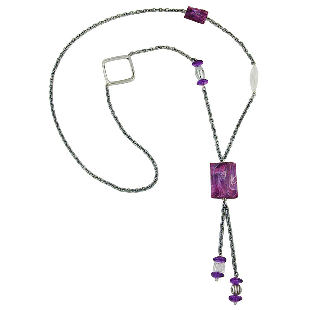 Dekorative Modeschmuck-Kette in Y-Form mit baumelnden Enden, 90cm lang. Blickfang ist die 35x25mm große, lila-weiß-marmorierte, hochwertige Kunststoffperle in der Mitte, Pillow genannt - jede Perle ist ein Unikat! - in Kombination mit lilafarbenen, chrom- und kristall-weißen Kunststoffperlen, die an eine 4mm dicke, grau-eloxierte Ankerkette aus Aluminium gekettelt worden sind. Diese wunderschöne Kette mit den purpurfarbenen Farbtupfern unterstreicht die passenden Farben in Ihrer Kleidung oder setzt zusätzliche Akzente. Lange Ketten eignen sich gut als Pulloverketten und können ohne einen Verschluss zu öffnen über den Kopf angelegt werden.